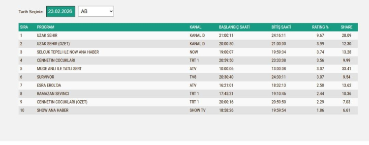 23 Şubat Pazartesi akşamı ekran rekabeti yine nefes kesti. Uzak Şehir hem yeni bölümü hem de özetiyle Total, AB ve ABC1 kategorilerinde zirve yarışında adından söz ettirdi. Dizi, güçlü hikâyesi ve sadık izleyici kitlesiyle ilk iki sıradaki yerini korudu.