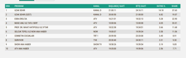 23 Şubat Pazartesi reyting sonuçları açıklandı. Uzak Şehir tüm kategorilerde ilk sıraları kaptırmazken, başrolü uyuşturucu soruşturmasında gözaltına alınan Cennetin Çocukları’nda dikkat çeken düşüş yaşandı.