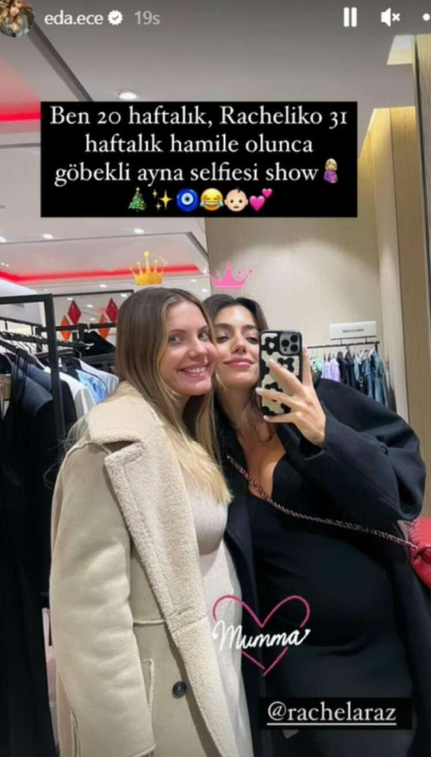 Anne olmak için gün sayan güzel oyuncudan ilk poz geldi. İlk üç ayını zor geçiren Ece, 7,5 aylık hamile fenomen Rachel Araz ile alışverişe çıktı. Araz ile ayna karşısına karınlarını göstererek verdiği pozu yayınlayan Ece, "Ben 20 haftalık, Racheliko 31 haftalık hamile olunca göbekli ayna selfiesi" notunu yazdı.