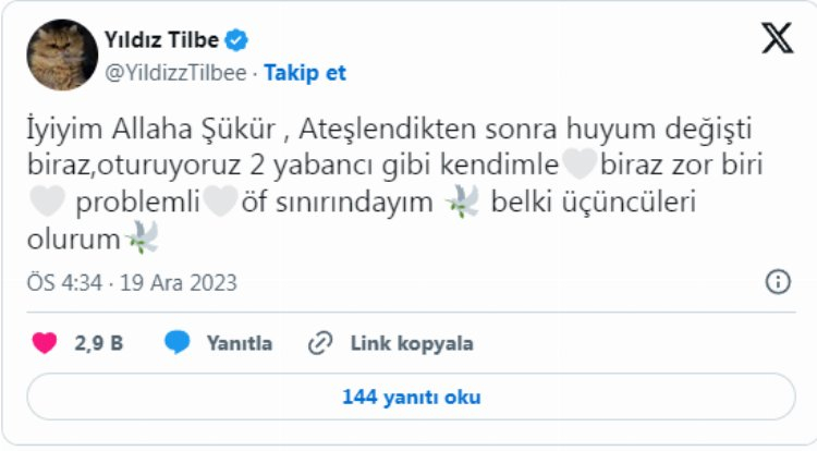 Sağlık durumuna ilişkin sosyal medya hesabından açıklama yapan Tilbe, "İyiyim Allaha şükür. Ateşlendikten sonra huyum değişti biraz, oturuyoruz iki yabancı gibi kendimle. Biraz zor biri, problemli, öf sınırındayım, belki üçüncüleri olurum" ifadelerini kullandı.