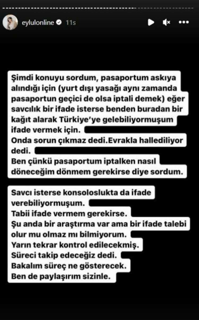 Eylül Öztürk açıklamasında "Şimdi konuyu sordum pasaportum askıya alındığı için (yurt dışı yasağı aynı zamanda pasaportun geçici de olsa iptali demek) eğer savcılık bir ifade isterse benden buradan bir kağıt alarak Türkiye'ye gelebiliyormuşum ifade vermek için" diyerek şunları söyledi: