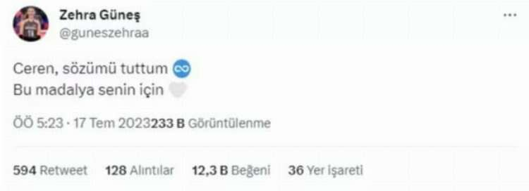 Zehra Güneş, Mehmet Bekmez'in depremden sonra yaptığı paylaşımla Ceren Topal'dan haberdar olmuştu. Hatay Kadın Voleybol Kulübü'nün oyuncusu olan 14 yaşındaki Ceren Topal hayalinin Zehra Güneş olmak olduğunu açıklamıştı. Daha sonra Kahramanmaraş merkezli gerçekleşen depremde hayatını kaybeden Ceren'in hayalini öğrenen Güneş ilk maçında "Ceren" formasıyla mücadele etti.