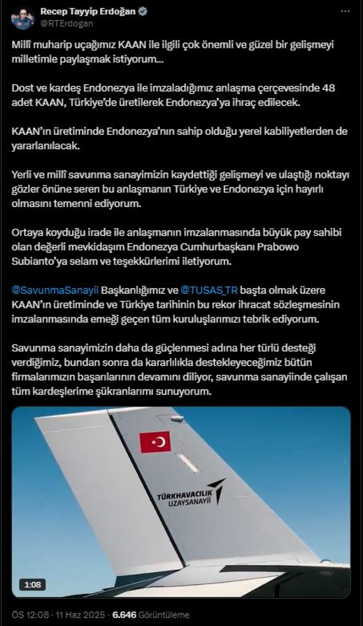Cumhurbaşkanı Recep Tayyip Erdoğan, "Dost ve kardeş Endonezya ile imzaladığımız anlaşma çerçevesinde 48 adet KAAN, Türkiye'de üretilerek Endonezya'ya ihraç edilecek. KAAN'ın üretiminde Endonezya'nın sahip olduğu yerel kabiliyetlerden de yararlanılacak" dedi.