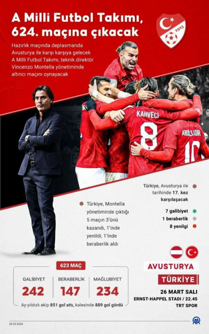 Hazırlık maçında Avusturya ile deplasmanda karşılaşacak olan A Milli Futbol Takımı, tarihindeki 624. karşılaşmaya çıkacak.