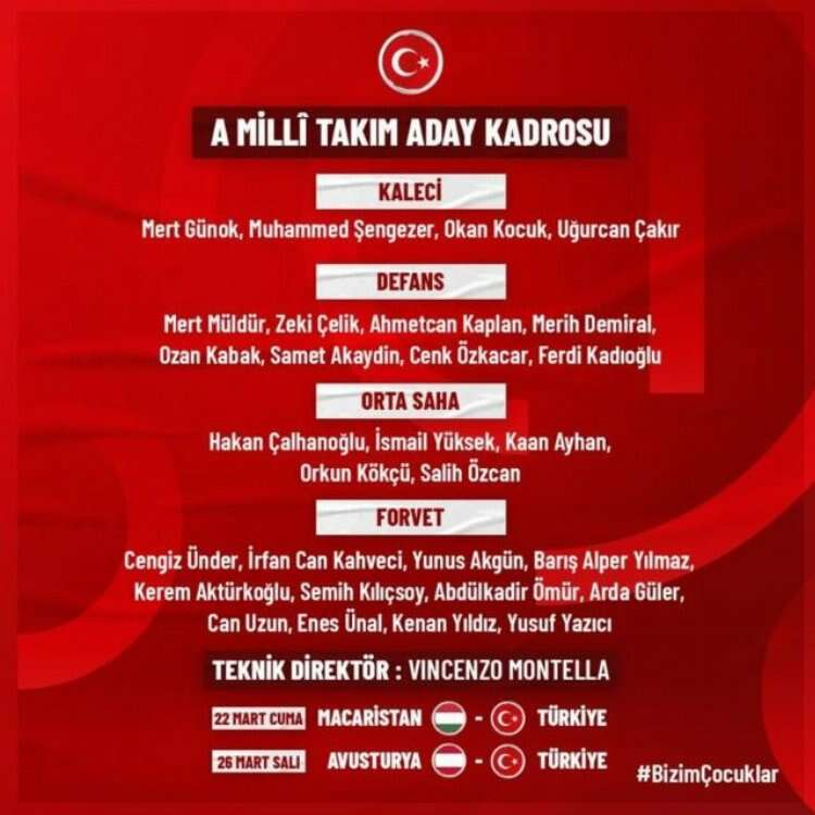 A Milli Futbol Takımımızın, 22 Mart’ta Macaristan ve 26 Mart’ta Avusturya ile yapacağı özel maçların aday kadrosu açıklandı.