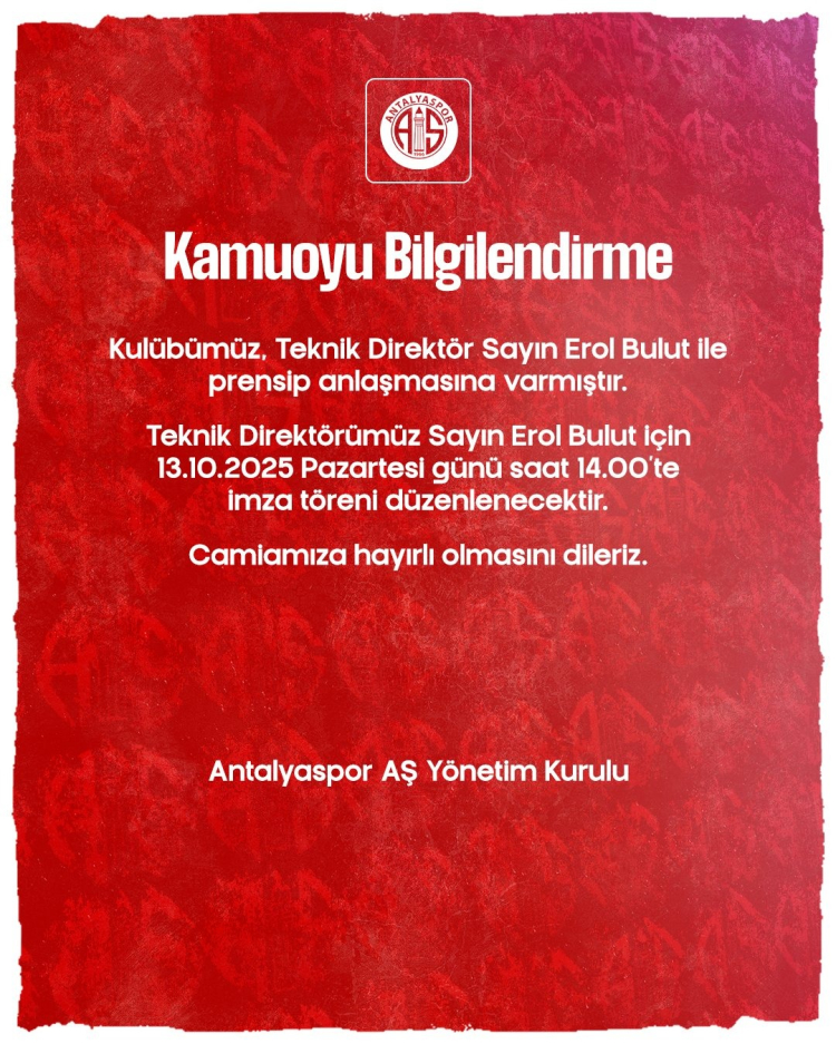 Trendyol Süper Lig ekiplerinden Antalyaspor, Teknik Direktör Erol Bulut ile prensip anlaşmasına varıldığını açıkladı.