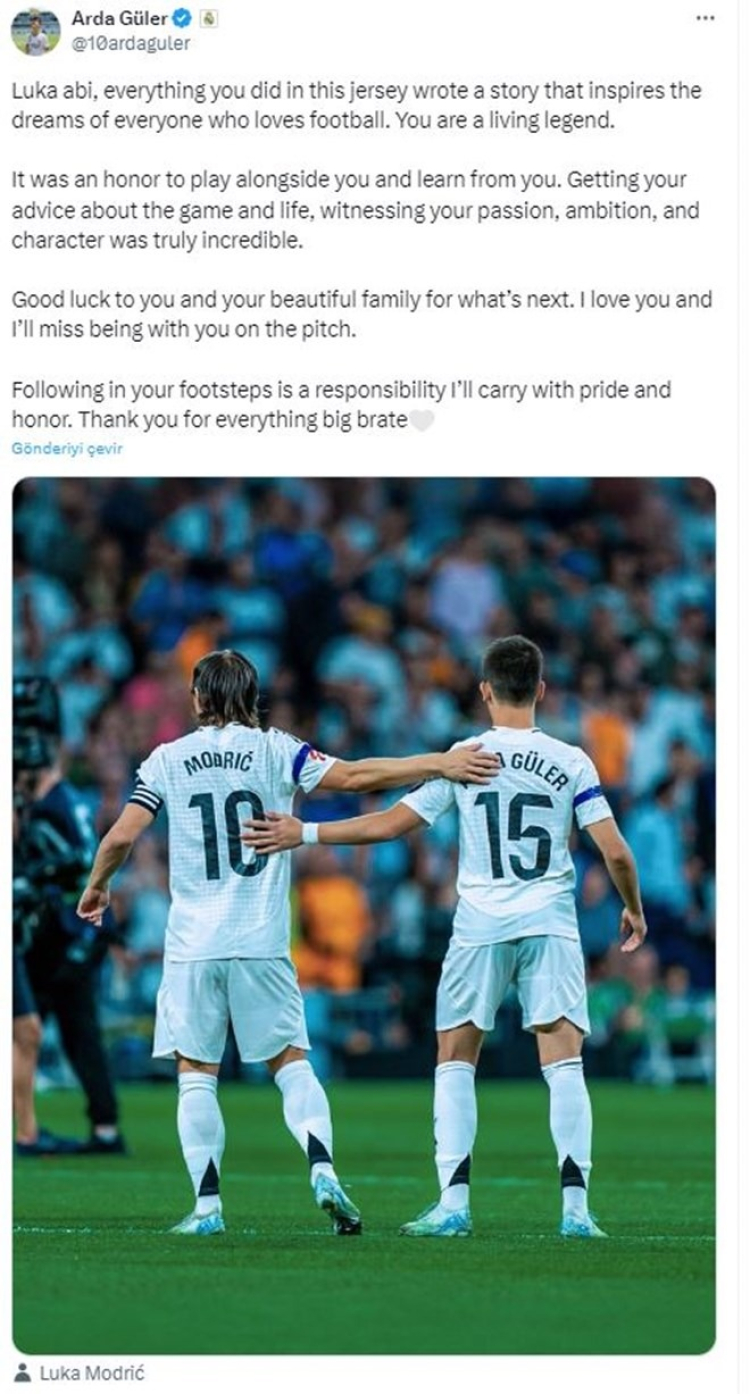 Real Madrid'de Luka Modric için paylaşım yapan futbolcular arasında Arda Güler de vardı. Milli yıldız, Modric'e duygusal bir açıklamayla veda etti. Arda Güler'in paylaşımında şu ifadeler yer aldı: