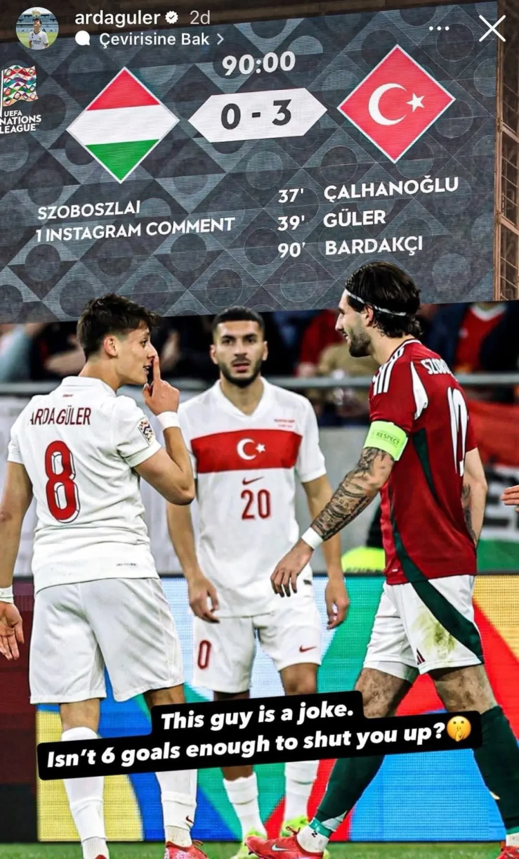 Arda Güler ve Dominik Szoboszlai arasındaki gerilim devam ediyor. Milli yıldız Arda Güler, bu sefer de attığı hikâye ile Dominik Szoboszlai'ye cevap verdi ve "Bu adam şaka gibi." dedi.