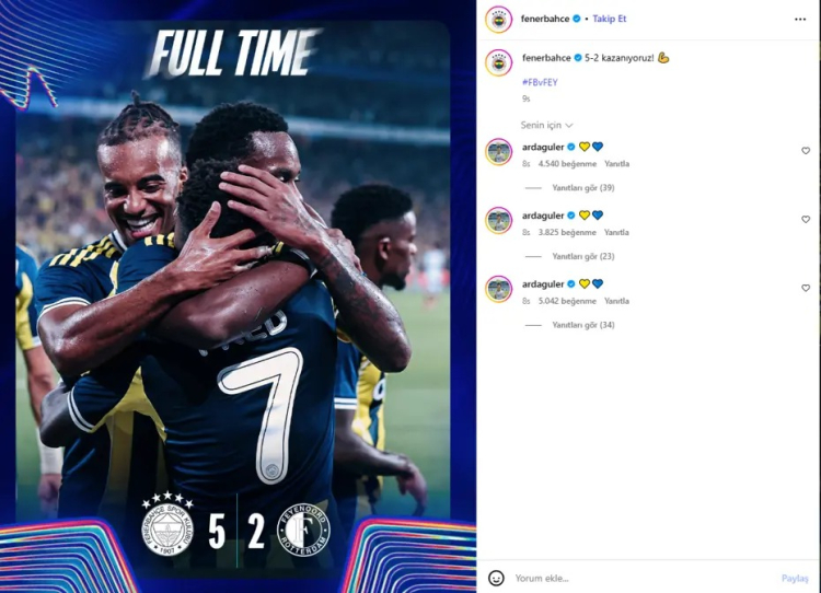 Arda Güler, Fenerbahçe'nin sosyal medya hesabından yaptığı maç sonu paylaşımına 3 ayrı yorum yaptı ve sarı-lacivert kalp emojisi bıraktı.
