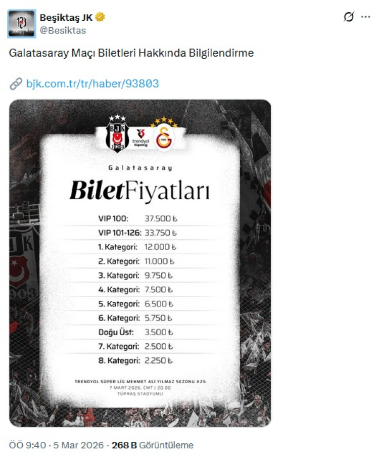 Trendyol Süper Lig'de Beşiktaş ile Galatasaray 25. hafta mücadelesinde karşı karşıya gelecek. 7 Mart'ta oynanacak derbi öncesinde dev maçın bilet fiyatları belli oldu.