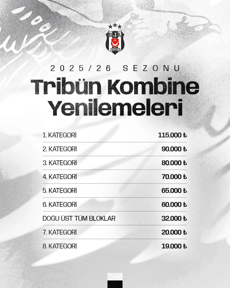 "Beşiktaşımızın 2025–26 futbol sezonunda Tüpraş Stadyumu’nda oynayacağı iç saha karşılaşmalarını kapsayan kombinelerin yenileme dönemi, yarın (23 Haziran) saat 10.00’dan itibaren Tüpraş Stadyumu Kombine Satış Ofisi’nde ve Passo mobil uygulamasında başlıyor."