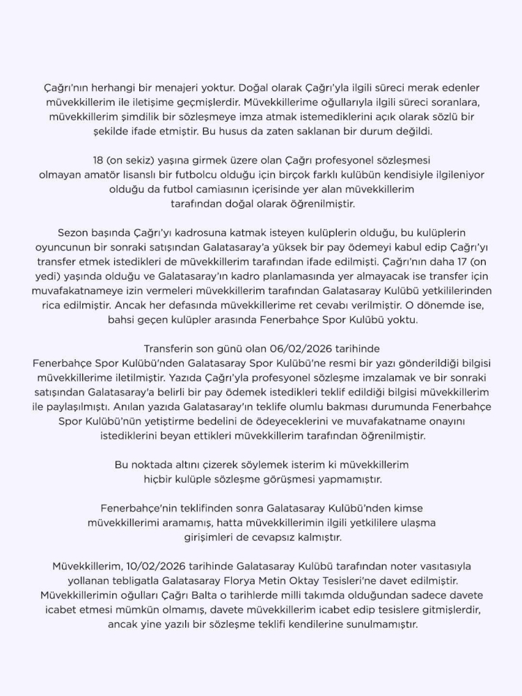 -Transferin son günü olan 06/02/2026 tarihinde Fenerbahçe Spor Kulübü'nden Galatasaray Spor Kulübü'ne resmi bir yazı gönderildiği bilgisi müvekkillerime iletilmiştir.