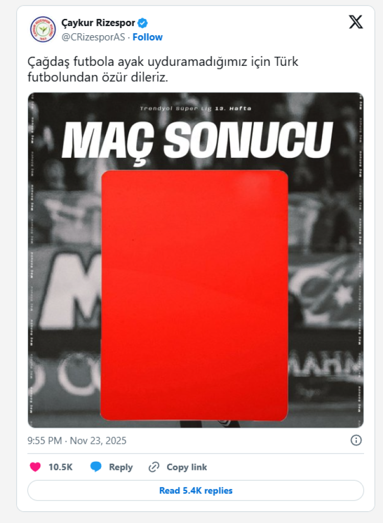 Fenerbahçe, Trendyol Süper Lig'de Çaykur Rizespor deplasmanına çıktı. Maçın ilk bölümünde 2-0 öne geçen Karadeniz temsilcisi; ardından ise skoru koruyamadı ve kırmızı kartın da olduğu süreçte, heyecanlı mücadele 5-2 Fenerbahçe lehine sonuçlandı. Ardından ise Çaykur Rizespor, sosyal medyadan Fenerbahçe'ye ve hakeme göndermelerde bulundu.