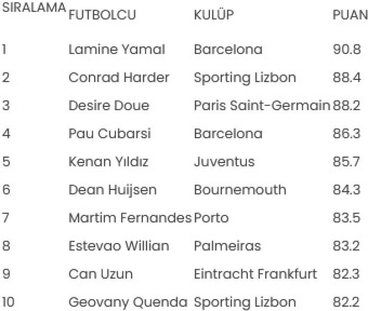 Barcelona'nın genç İspanyol yıldızı Lamine Yamal'ın başı çektiği listede, Serie A ekibi Juventus'ta oynayan Kenan Yıldız beşinci, Alman takımı Eintracht Frankfurt'ta forma giyen Can Uzun ise dokuzuncu sırada kendine yer buldu.