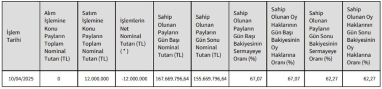 Pay satış fiyatı 46,10 TL’dir. İşlem sonucunda Fenerbahçe Spor Kulübü’nün, Fenerbahçe Futbol A.Ş.’de sahip olduğu payların oranı %62,27’ye düşmüştür. Kamuoyuna ve yatırımcılarımıza saygıyla duyurulur. Özel Durumlar Tebliği madde 11 uyarınca iş bu açıklamamıza konu işlemin detaylarına ilişkin bilgiler aşağıdaki tabloda verilmektedir.