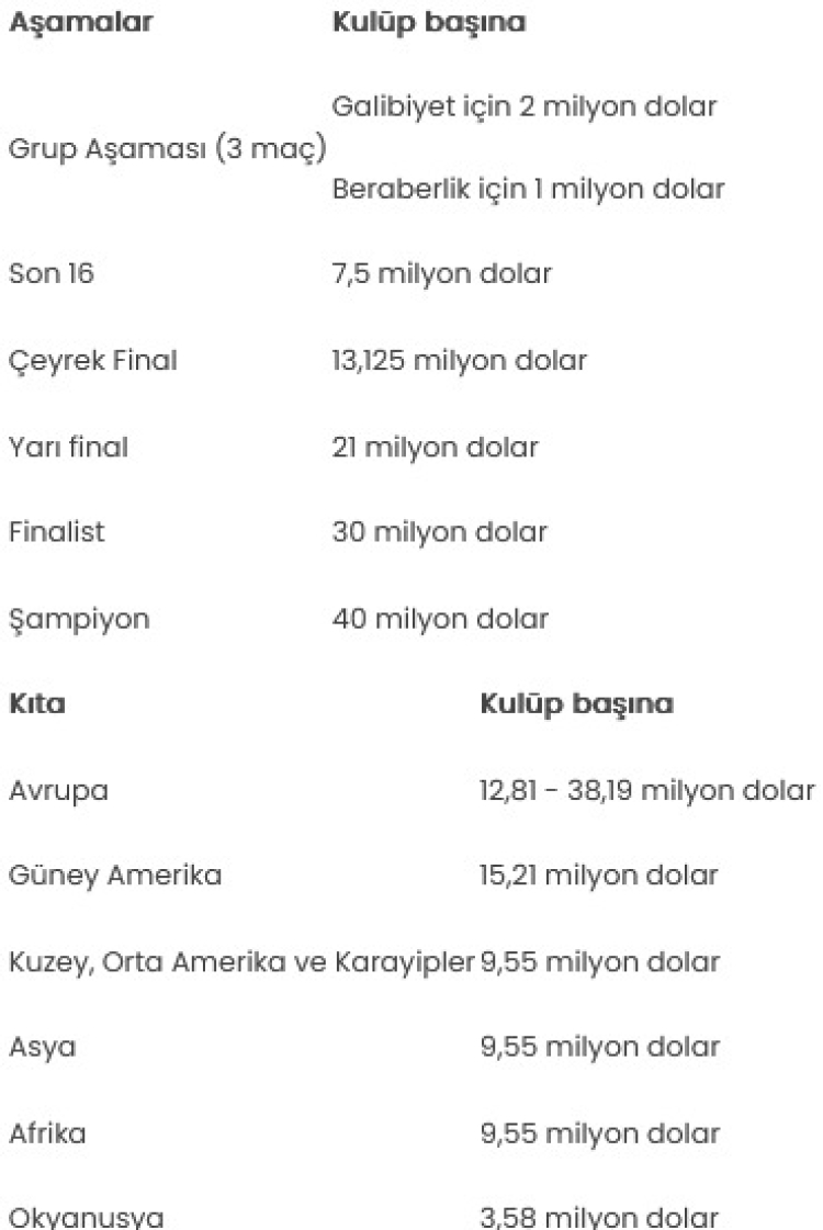 2025 FIFA Kulüpler Dünya Kupası'nın para ödülü dağıtım modeli şu şekilde:
