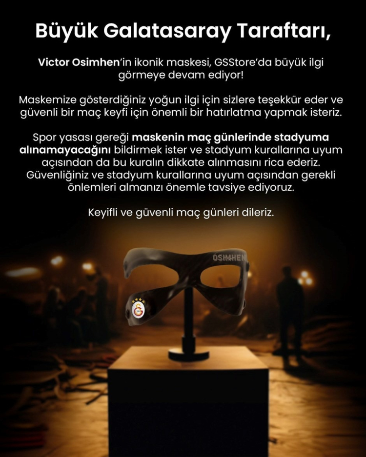 Galatasaray'dan yapılan açıklamada, "Büyük Galatasaray taraftarı, Victor Osimhen'in ikonik maskesi, GSStore'da büyük ilgi görmeye devam ediyor! Maskemize gösterdiğiniz yoğun ilgi için sizlere teşekkür eder ve güvenli bir maç keyfi için önemli bir hatırlatma yapmak isteriz. Spor yasası gereğince maskenin maç günlerinde stadyuma alınmayacağını bildirmek ister ve stadyum kurallarına uyum açısından da bu kuralın dikkate alınmasını rica ederiz. Güvenliğiniz ve stadyum kurallarına uyum açısından gerekli önlemleri almanızı önemle tavsiye ediyoruz. Keyifli ve güvenli maç günleri dileriz." ifadeleri yer aldı.