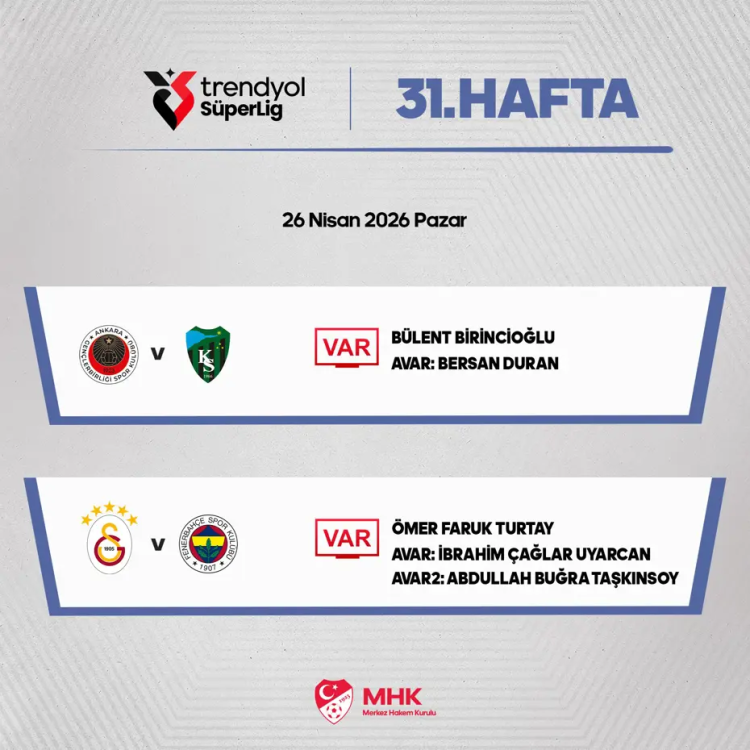 Trendyl Süper Lig'de Galatasaray ile Fenerbahçe karşı karşıya gelecek. Dev derbi öncesinde Türkiye Futbol Federasyonu, karşılaşmada görev alacak VAR hakemlerini açıkladı.