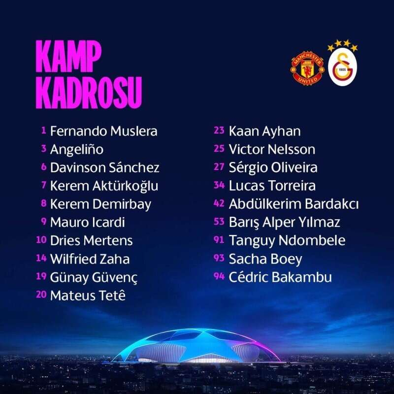 Temsilcimiz Galatasaray, UEFA Şampiyonlar Ligi A Grubu 2. haftasında yarın İngiltere'nin Manchester United ekibiyle deplasmanda yapacağı maçın kamp kadrosu açıklandı.