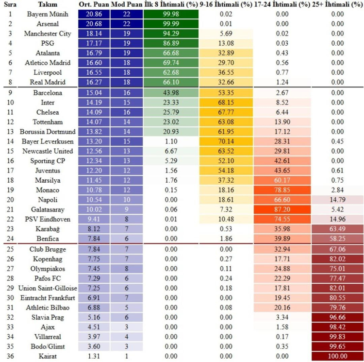 17 puan: İlk 8 sırayı ve Şampiyonlar Ligi Son 16 Turu'na doğrudan kalmayı garantiler!
