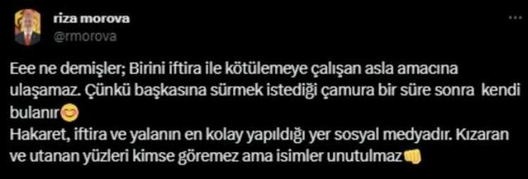 Morova paylaşımında ''Eee ne demişler; Birini iftira ile kötülemeye çalışan asla amacına ulaşamaz. Çünkü başkasına sürmek istediği çamura bir süre sonra kendi bulanır. Hakaret, iftira ve halkın en kolay yapıldığı yer sosyal medyadır. Kızaran ve utanan yüzleri kimse göremez ama isimler unutulmaz.'' ifadelerini kullandı.