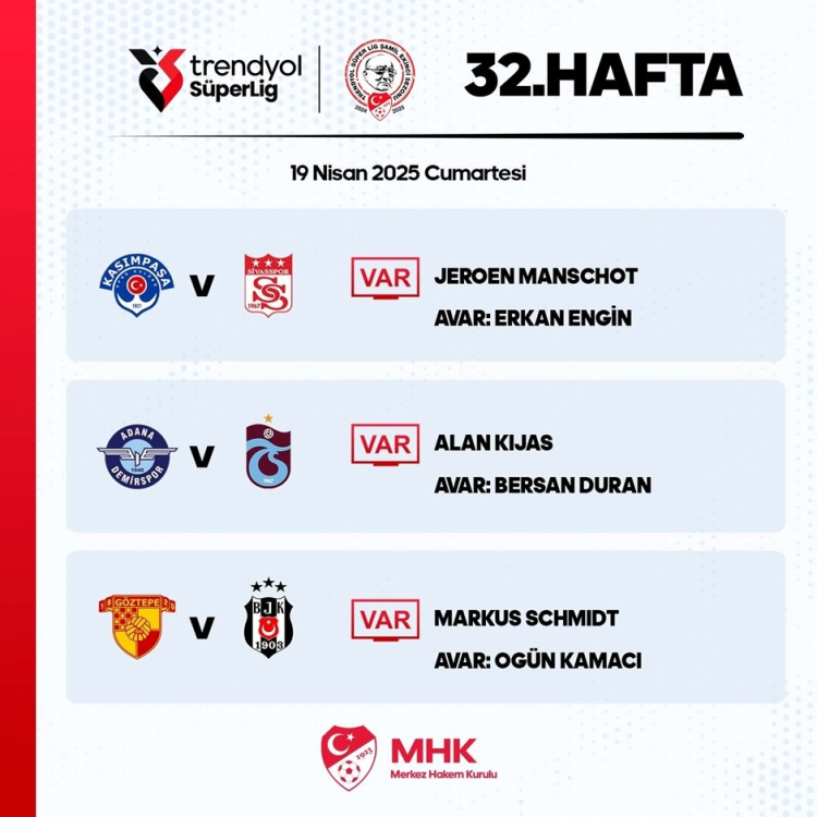 Süper Lig'in 32. haftasında Beşiktaş, deplasmanda Göztepe ile karşılaşacak. Mücadelenin VAR hakemi dün Galatasaray-Bodrum FK karşılaşmasında da görev alan Markus Schmidt oldu.