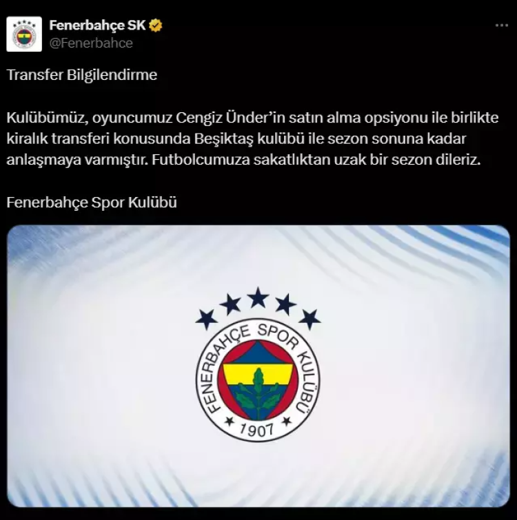 Beşiktaş'tan yapılan açıklamada ise, "Profesyonel futbolcu Cengiz Ünder'in 2025-26 sezonu sonuna kadar satın alma opsiyonlu geçici transferi hususunda Fenerbahçe SK ile anlaşmaya varılmıştır. Cengiz Ünder'e şanlı formamızla başarılar diler, kamuoyunun bilgisine saygılarımızla sunarız." ifadeleri kullanıldı.
