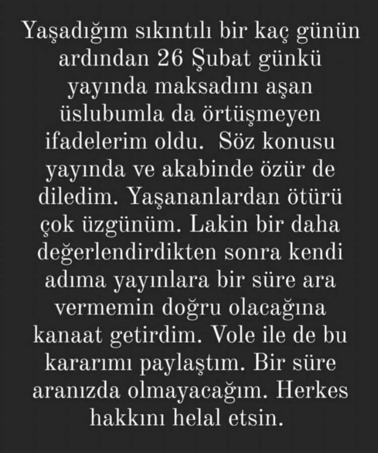 Yayın sonrası özür dileyen Çelikler, bir süre ekranlara çıkmayacağını ve dinleneceğini ifade etmişti.