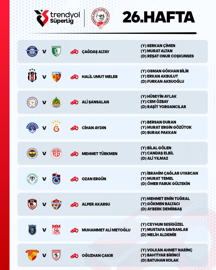 Trendyol Süper Lig'in 26. haftasında oynanacak maçları yönetecek hakemler belli oldu.
