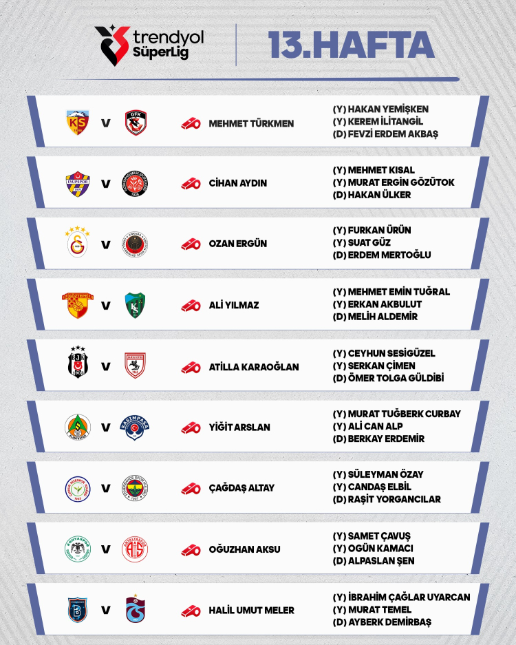 TFF, Trendyol Süper Lig'de 13. hafta maçlarını yönetecek hakemleri açıkladı.