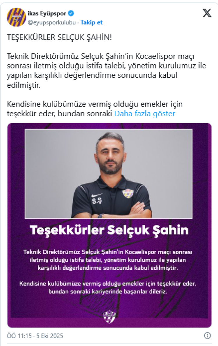 Trendyol Süper Lig ekiplerinden Eyüpspor, teknik direktör Selçuk Şahin'in istifasının kabul edildiğin açıkladı.