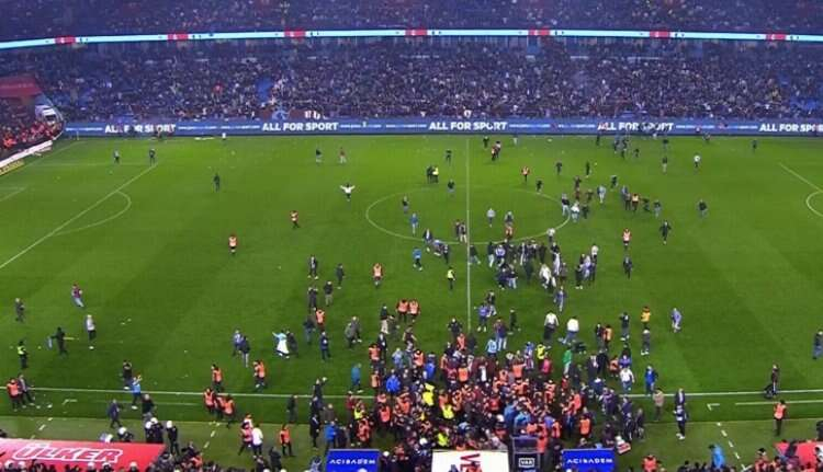 Tribünlerde bulunan bordo-mavili bazı holiganlar sahaya dalarak Fenerbahçeli futbolculara saldırdı. Fenerbahçeli futbolcular, saldıran taraftarların arasından soyunma odasına gitmeye çalıştı.