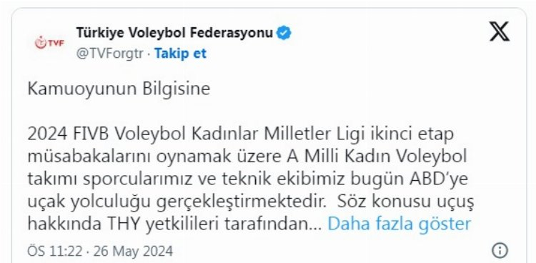 “2024 FIVB Voleybol Kadınlar Milletler Ligi ikinci etap müsabakalarını oynamak üzere A Milli Kadın Voleybol takımı sporcularımız ve teknik ekibimiz bugün ABD’ye uçak yolculuğu gerçekleştirmektedir. Söz konusu uçuş hakkında THY yetkilileri tarafından federasyonumuza karşı ifadeler içeren, gerçeği yansıtmayan açıklamalar sebebi ile kamuoyunu bilgilendirmek zaruri hale gelmiştir.