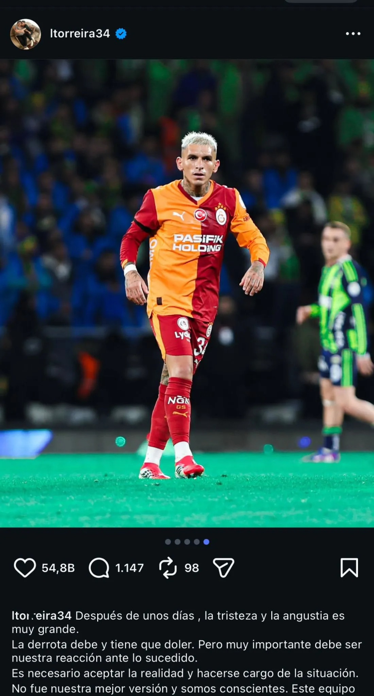 10 Ocak'ta oynana Turkcell Süper Kupa finalinde Fenerbahçe'ye 2-0 mağlup olarak kupayı elinden kaçıran Galatasaray'ın orta saha oyuncusu Lucas Torreira, kişisel sosyal medya hesabından bu mağlubiyete değindi.