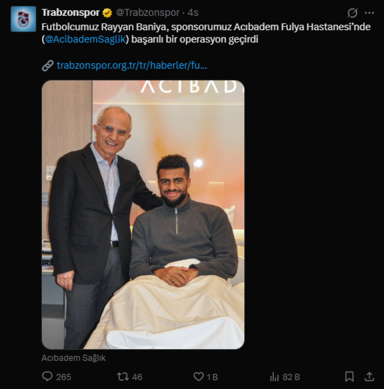 Beşir, "Futbolcumuz Rayyan Baniya'ya sponsorumuz Acıbadem Fulya Hastanesi'nde ortopedi ve travmatoloji uzmanı Dr. Mustafa Şengün tarafından, sol kaval kemiği stres kırığı tanısıyla operasyon uygulanmıştır. Sağlık ekibimiz tarafından fizik tedavi ve rehabilitasyon sürecine başlanacak oyuncumuza geçmiş olsun dileklerimizi iletiyoruz" ifadelerini kullandı.