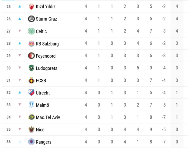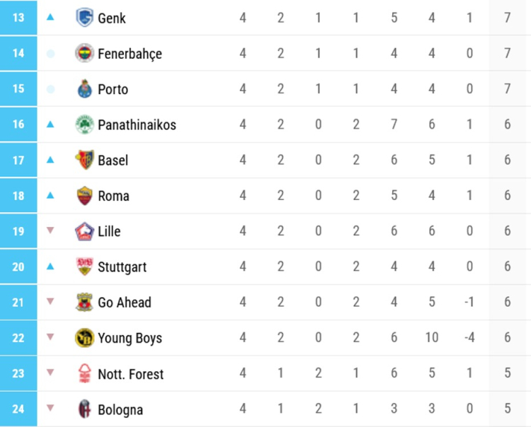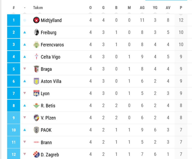 Fenerbahçe ilk 4 haftayı, ilk 8'de tamamlayamadı. Midtjylland, 4 haftadaki tüm maçlarını kazanan tek takım oldu.