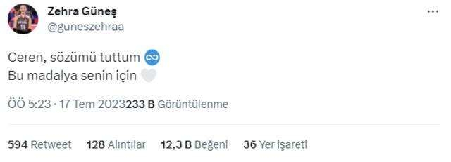 A Milli Kadın Voleybol Takımı, 2023 FIVB Milletler Ligi finalinde Çin'i 3-1 mağlup ederek şampiyon oldu. Filenin Sultanları, bu şampiyonluğun ardından dünya sıralamasında 1 numaraya yükseldi. Maçın ardından paylaşım yapan Zehra Güneş, taraftarları hüzünlendirdi. Şampiyonluğu, deprem felaketinde hayatını kaybeden Hatay Voleybol Kulübü oyuncusu Ceren Topal'a armağan eden Zehra Güneş'in paylaşımına binlerce beğeni geldi.