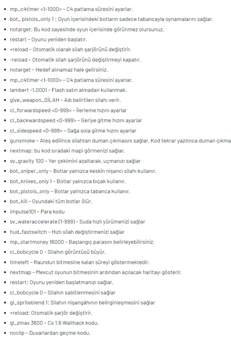 EN ÇOK KULLANILAN CS 1.6 KODLARI