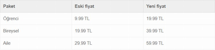 Apple Music'in rakibi Spotify, son olarak Temmuz ayında abonelik ücretlerine zam uyguladı. Spotify'da öğrenci paketi 21.99 TL, bireysel abonelik 39.99 TL, Duo iki hesap 54.99 TL ve Aile paketi 64.99 TL.