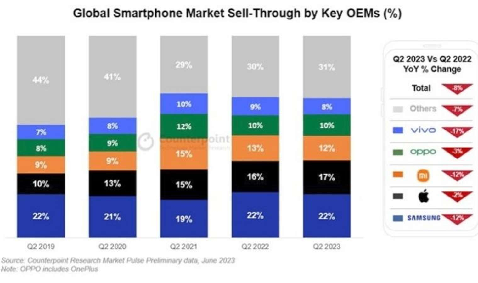 Counterpoint Research tarafından yayınlanan ve 2023 yılının ikinci çeyreğini kapsayan çalışmanın raporuna göre en çok satan marka yüzde 22 ile Samsung oldu.