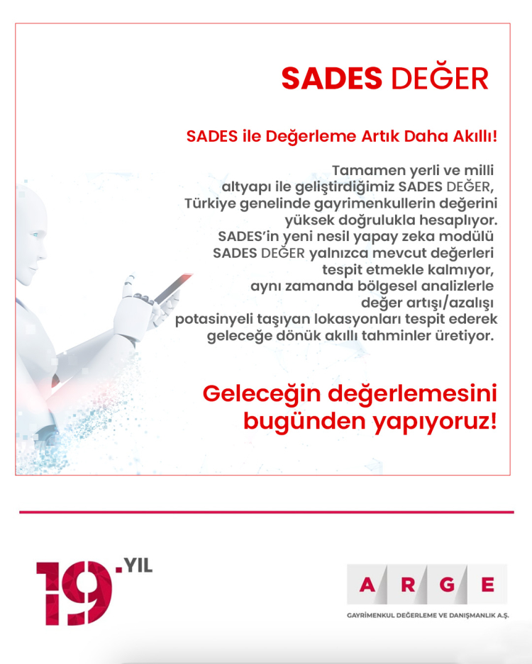 Tamamen yerli kaynaklarla geliştirilen SADES (Sayısal Akıllı Değerleme Sistemi), gayrimenkul sektörüne yepyeni bir vizyon getiriyor. Yapay zekâ tabanlı altyapısıyla dikkat çeken sistem, hem mevcut gayrimenkul değerlerini analiz ediyor hem de geleceğe yönelik öngörülerde bulunabiliyor.
