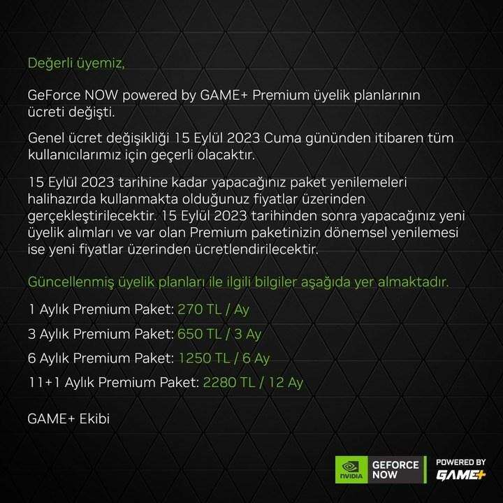 Abonelere gönderilen bilgilendirme e-postasına göre 15 Eylül 2023 tarihinden itibaren GeForce Now fiyatı Türkiye’de artacak. 15 Eylül tarihine kadar yapılacak satın alımlar ise kullanmakta olunan fiyatlar üzerinden gerçekleştirilecek. 15 Eylül, yani yarından sonraki satın alımlarda ise aşağıdaki güncel fiyatlar geçerli olacak.