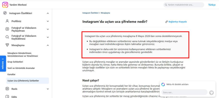 Instagram'ın resmi Yardım Merkezi sayfasında bu tarihten sonra uçtan ucu şifrelenmiş mesajlaşmanın neden desteklenmeyeceğine dair bir açıklama yok ancak 8 Mayıs 2026 tarihinin verildiği kısmın hemen altında bu değişiklikten etkilenen sohbetleri olan kullanıcıların tutmak isteyebilecekleri medya veya mesajları nasıl indireceklerine ilişkin talimatlar görecekleri belirtiliyor.