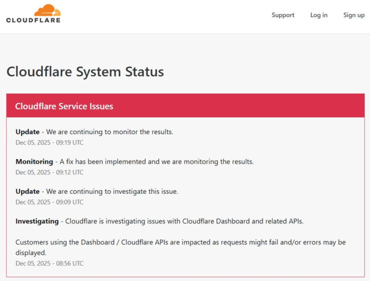 Cloudflare Dashboard ve ilgili API'lerle ilgili sorunları araştırdığını bildiren Cloudflare, bir düzeltme uygulandığını ve sonuçların izlendiğini de belirtti.