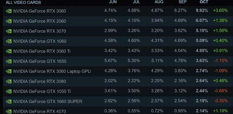 Her zaman olduğu gibi ekran kartı kategorisinden başlayacak olursak RTX 3060, Ekim ayında zirvedeki bir numaralı yerini sağlamlaştırdı. Eylül ayında GTX 1650'nin tacını çalan ekran kartı, yüzde 3,65 artışla bir kez daha ayın en iyi performans gösteren modeli oldu. Öyle ki Steam kullanıcılarının neredeyse yüzde 10'unda bulunuyor.