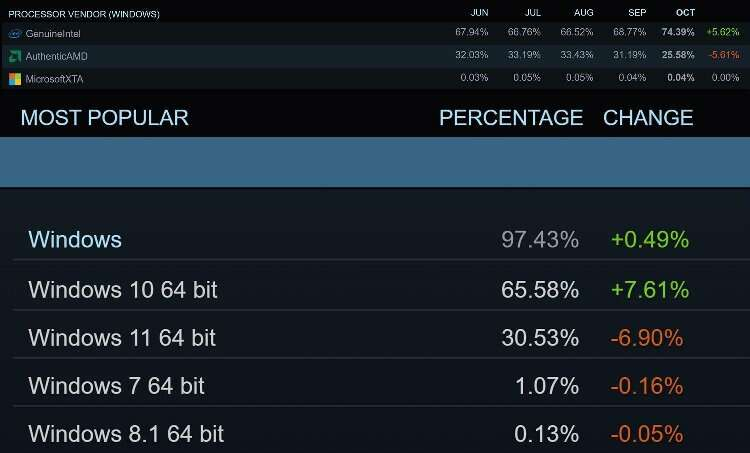 Steam'in Ekim Ayı Donanım Anketi açıklandı: Windows 11 ve AMD serbest düşüşte