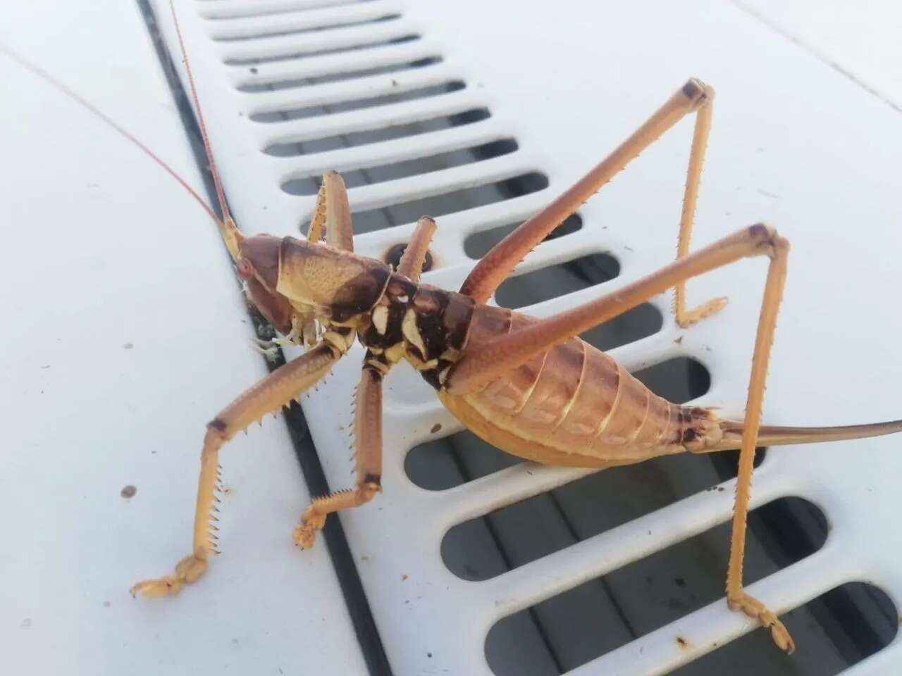 İlçede yaşayan çiftçi Edip Turgut, otomobilinin üzerinde yaklaşık 25 santimetre uzunluğunda etçil çekirge buldu.