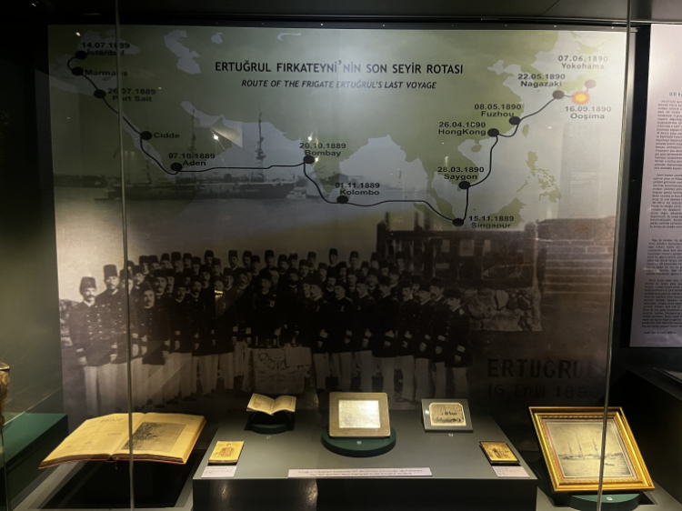 İstanbul Deniz Müzesi'ndeki sergide, 30 Eylül 1890'deki kazadan kurtulan personelin Kobe'den yazdığı rapor, Ertuğrul Fırkateyni'nden kalan eşyayı gösteren fotoğraflar, Ertuğrul Anıtı fotoğrafı, fırkateynin yağlı boya tablosu, şehit yakınları ve kazazedeler için yardım kampanyası başlatan Japon iş insanı Torajiro Yamada'ya II. Abdülhamid döneminde verilen nişan, bağış makbuzları, 3 Haziran 1937'de Oşima Adası'nda açılışı yapılan "Ertuğrul Anıtı"nın hatırasına yaptırılan madalya, 69 Osmanlı levendini İstanbul'a getiren "Kongo" ve "Hiei" isimli gemilerin maketleri gibi birçok tarihi obje ziyaretçilerini bekliyor.