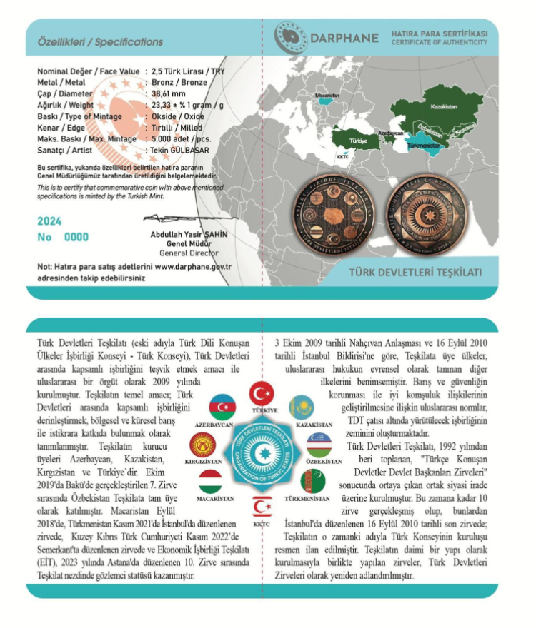 Ülkeler arasında daha güçlü bağların tesisini ve ortak bir gelecek inşasını hedef alan Teşiklat'ın kuruluşunun 15'inci yıl dönümünün geçen ay idrak edildiğini anımsatan Erdoğan, bu yıl dönümüne özel olarak Türk dünyasının yetiştirdiği büyük fikir adamı İsmail Gaspıralı'nın "dilde, fikirde, işte birlik" şiarına yer verdikleri hatıra parasını takdim etmenin mutluluğunu yaşadığını söyledi.