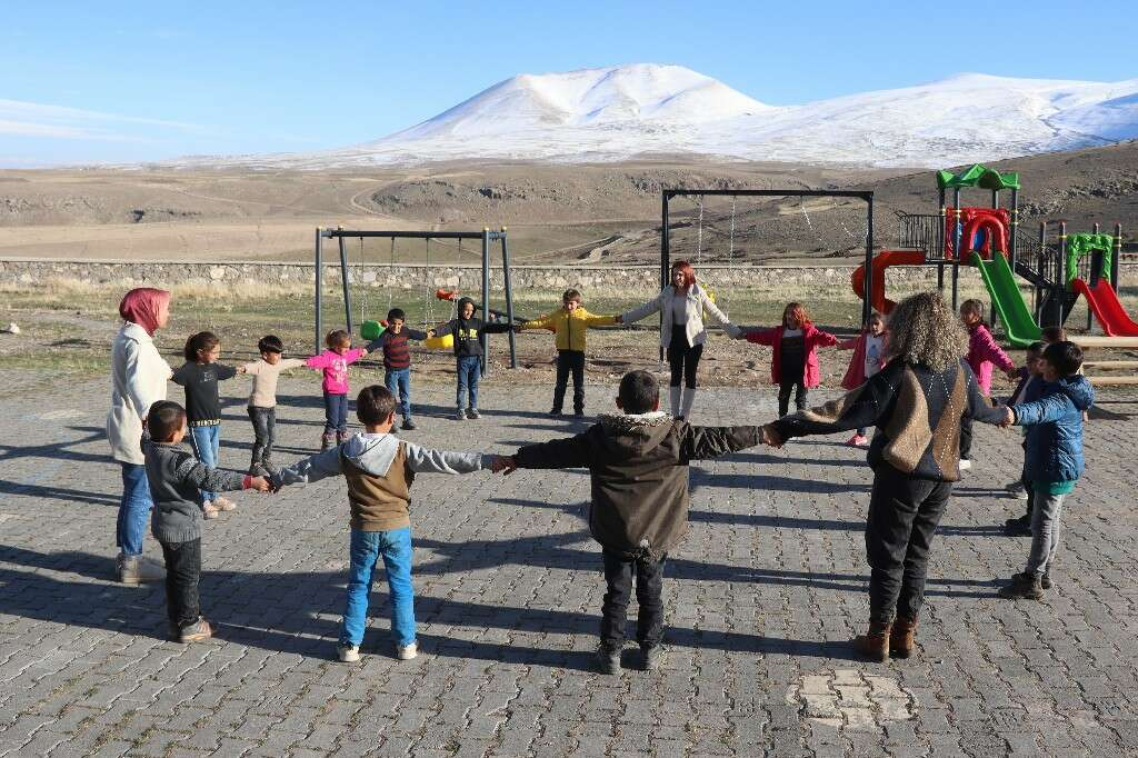 Çevresi karlı Aras Dağları ile çevrili köyün ilkokul ve ana okulunda görev yapan Bursa, Ankara ve Burdurlu 3 kadın öğretmen, şehir merkezine 33 kilometre uzaklıktaki yerleşim yerine her gün servis araçlarıyla gidip geliyor.